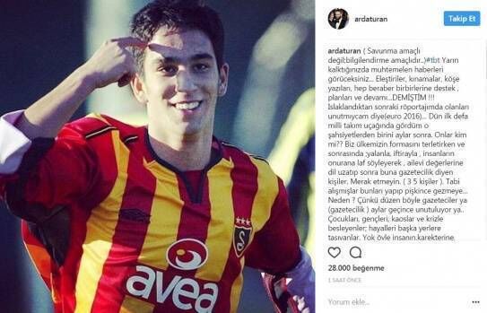 Arda Turan'ın Instagram hesabında paylaştığı yazı: (Savunma amaçlı değil; bilgilendirme amaçlıdır..) Yarın kalktığınızda muhtemelen haberleri görüceksiniz... Eleştiriler, kınamalar, köşe yazıları, hep beraber birbirlerine destek , planları ve devamı...DEMİŞTİM !!! Islaklandıktan sonraki röportajımda olanları unutmıycam diye (euro 2016)... Dün ilk defa milli takım uçağında gördüm o şahsiyetlerden birini aylar sonra. Onlar kim mi?? Biz ülkemizin formasını terletirken ve sonrasında ;yalanla, iftirayla , insanların onurana laf söyleyerek , ailevi değerlerine dil uzatıp sonra buna gazetecilik diyen kişiler. Merak etmeyin. ( 3 5 kişiler ). Tabi alışmışlar bunları yapıp pişkince gezmeye... Neden ? Çünkü düzen böyle gazeteciler ya (gazetecilik ) aylar geçince unutuluyor ya.. Çocukları, gençleri, kaoslar ve krizle besleyenler; hayalleri başka yerlere taşıyanlar. Yok öyle insanın,karekterine, ailesine değerlerine laf atmak. Unutmayanıda var bunun.!Benim futbolculuğumu eleştiren gerçek gazetecilere teşekkür etmişliğim vardır haklısınız diye...Çünkü bu meslek olabilir. Ama aileme, değerlerime olmaz; gücüm yettiğincede buna izin vermiycem...dün yaptığım doğrumuydu... bilmem!!! Evine misafir olup, adam satıp, iftira atıp arkadan iş çeviren olucağıma... Yüzüne, bağırarak ,hakaret ederek , saldırarak cevap beklerim... Belki doğru değil ama Dürüstçe, onurlu, şerefli bir davranış... Ha cevap aldım mı ?YOK kıvırmaca... ( klasik) aylarca sayfa doldurdu ;ama karsımda iki kelime yok .(gerçi yarın konuşurlar ) arkamdan..!!!Bu fotoğrafta gördüğünüz çocuk hayatta iyi veya kötü neyaptıysa bedelini ödedi; öderde..Allah tan başka kimseden birsey istemedi, beklemedi.. Hesabıda kimseye vermez...Arda Turan yola çıkarken İYİ FUTBOLCU, STAR , vs... olmak için ÇIKMADI... Şerefli,onurlu bir adam olmak için , ailesine sevdiklerine sahip olmak için ÇIKTI..Her kim Şerefime,aileme , onuruma laf etmeye kalkarsa ;Allah ın bana verdikleriyle, gücüm yettiğince karşılığını alır...iyi geceler"