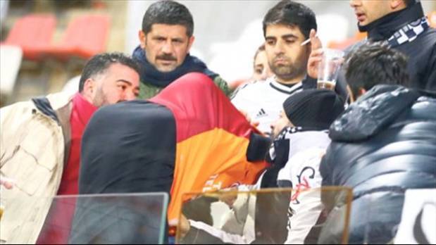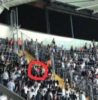 İki taraftarın üstünde Galatasaray forması olduğu için Beşiktaş taraftarı ikiliyi darp edip tribünden çıkarmak istedi.