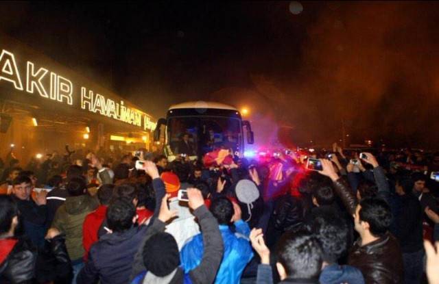 19.30'da şehre inen takımımızı, Diyarbakır'da kalabalık bir taraftar topluluğu karşıladı. Diyarbakırlı Galatasaraylılar, havaalanından otele kadar takımımıza meşale ve bayraklarla eşlik etti.