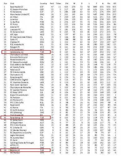 Beşiktaş 63 puanla 58. sırada yer aldı.