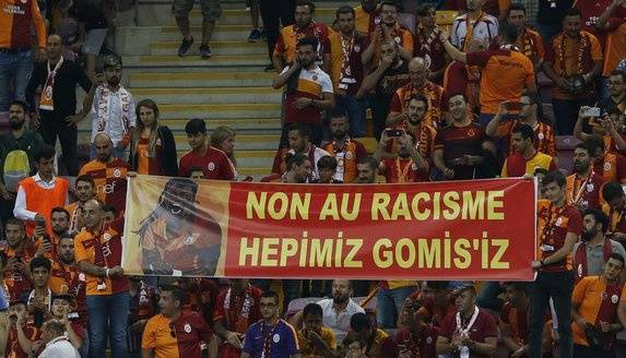Gomis'e destek vermek için tezahüratlar yapan taraftarlar, Fransızca olarak, "Non au racisme (Irkçılığa hayır)" ve "Hepimiz Gomisiz" pankartları açtı.