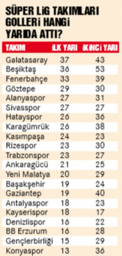 "G.Saray’ın sadece bu sezon değil, Terim’li son üç senenin tamamında en önemli özelliklerinden biri buydu: Maçlara genelde iyi başladılar. İlk yarıları iyi oynadılar. Özellikle pandemi öncesi Telekom’da ilk yarıda maçların fişini çekme konusunda ustalardı. Bu sezon da ilk devrelerde attıkları 37 golle, Süper Lig’in lideri konumundalar. Ancak ikinci yarı performanslarında Beşiktaş biraz daha ön plana çıkarak alt etmiş G.Saray’ı. Bu istatistiği görünce de akla şu detay geliyor: Galatasaray’ın Falcao, Arda, Babel, Feghouli, Belhanda gibi tecrübeli yıldızları performanslarını çoğunlukla 90 dakikaya yayamadılar. İyi ilk yarı oynadılarsa, ikinci devrelerde düştüler."