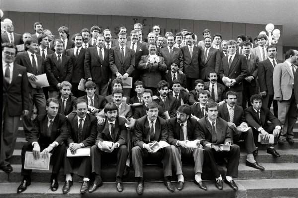 Başbakan Turgut Özal, Avusturya'yı 3-0 mağlup eden A Milli Futbol Takımı futbolcu ve yöneticilerini kabul etti. Özal, futbolculara 15 konut sertifikası, birer adet saat, 25'er altın, beşer milyon liralık mevduat çeki verdi. / 30 Ekim 1988