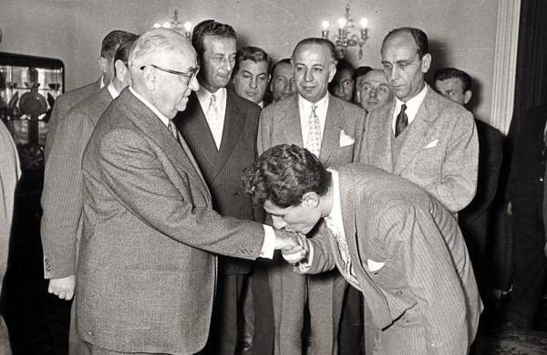 Macaristan'ı 3-1 yenen A Milli Futbol Takımı, Ankara'da Cumhurbaşkanı Celal Bayar'ı ziyaret etti. / 1956