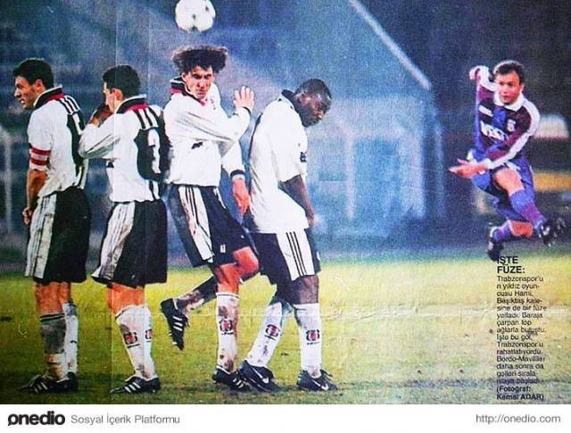 Avni Aker Stadı Şubat 1998 | Hami Mandıralı'nın frikik golü. Barajda Alpay, Tayfur, Emre ve Amokachi var. (TS-BJK)